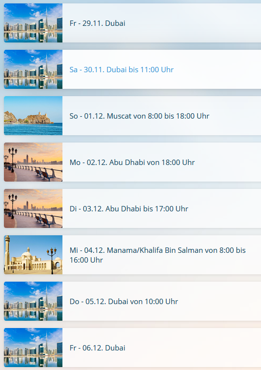 Der Flug geht nach Abu Dhabi, von dort geht der Transfer nach Dubai.