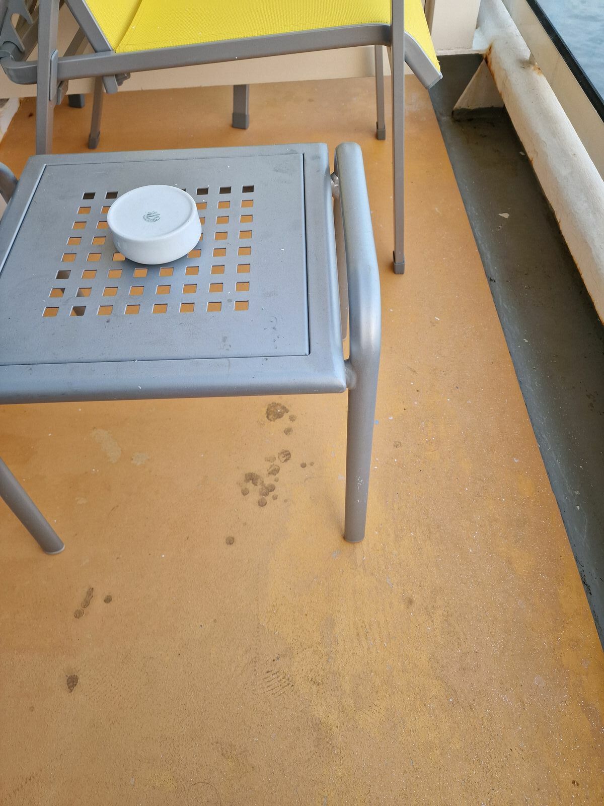 Auf TUI Schiffen kenne ich mich nicht aus, aber ich kann euch ein paar "hübsche" Bilder vom Balkon der Aida Bella zeigen, den ich seit zwei Wochen meinen nennen darf. Habe noch nie einen schlimmeren Balkon gehabt, da trägt man sich immer die abgeblätterte Farbe in die Kabine. Auf die schwarzen Flecken will ich gar nicht drauftreten, wer weiss was das ist.....und die Balkonscheiben sind ganz trüb, von wegen Durchgucken.