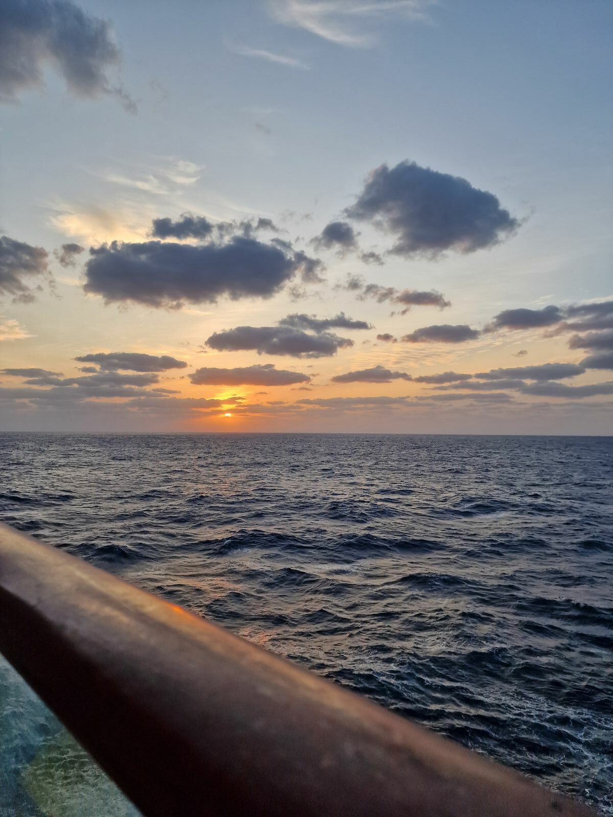Jetzt taucht die Sonne bald bei uns auf, ich sehe auf Deck 6 schon die Liegestühle und die Fusshocker in Sonnenposition.