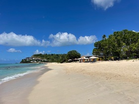 Wir hatten mit einem Taxi eine Rundfahrt mit Shirley Hights und Nelsons Dockyard und Strandaufenthalt ausgemacht. Der Fahrer hat uns dann zum Darkwood Beach gebracht. Abgesetzt hat er uns am belebtem Teil mit mehreren Beach Bars. Wir sind dann eher in die Mitte gegangen und haben uns dort unter einen Baum in den Schatten gelegt. Dort gab es eine Steinplatte im Wasser, die wir umrundet haben. Dafür hatten wir es schön ruhig. Uns hat es dort gefallen. Eine kleine unaufdringliche Beach Bar war nebenan. Dort haben wir uns mit Getränken versorgt.
