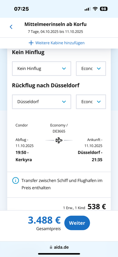 So sieht das dann aus, ich würde viel lieber schon ein Tag eher anreisen, der Hinflug ist auch erst nachmittags, wenn man über Aida bucht. Also Mega blöde zeiten.