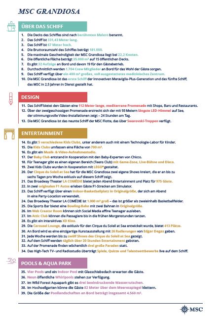 Mit 11 Restaurants, 21 Bars und Lounges, erstklassigem Entertainment und einer beeindruckenden, mediterranen Promenade als Herzstück des Schiffes bietet die MSC Grandiosa viele gute Gründe für das perfekte Kreuzfahrterlebnis: