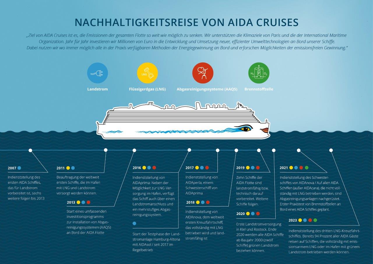 Bis 2023 werden zwei weitere dieser innovativen Schiffe auf Reisen gehen. Auch auf den Schiffen der bestehenden Flotte rüstet das Unternehmen kontinuierlich modernste Umwelttechnik nach. Die Nutzung von LNG, Landstrom aus regenerativen Energien, der Einsatz von modernen Abgasreinigungssystemen, die Reduzierung bzw. komplette Vermeidung von Plastik- und Einwegprodukten oder die Vermeidung von Lebensmittelabfällen an Bord sind zentrale Themen, denen sich AIDA Cruises stellt.