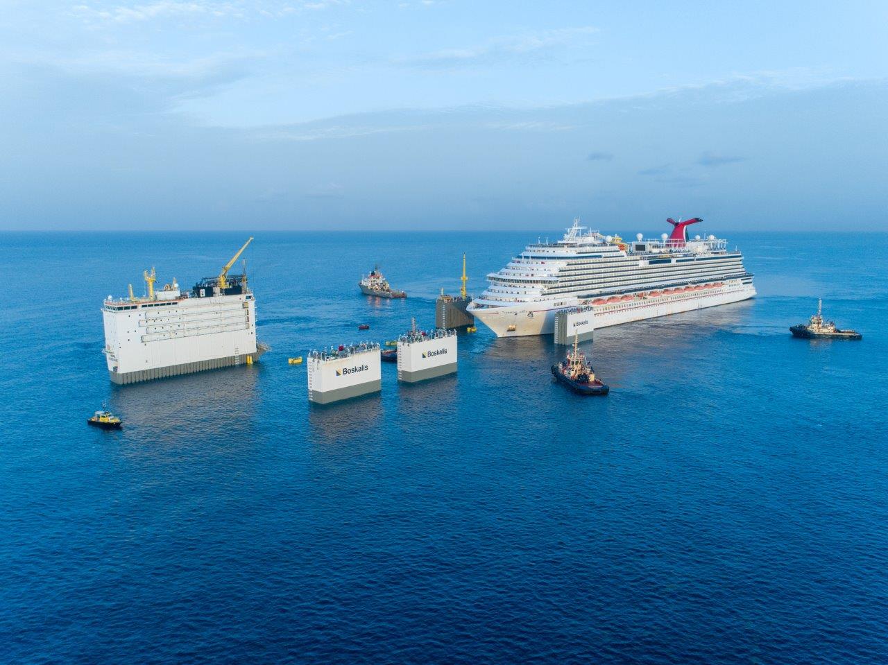Eine im wahrsten Sinne des Wortes „tragende“ Rolle spielt dabei mit der Boka Vanguard des holländischen Unternehmens Boskalis ein sogenanntes „Halbtaucherschiff“. Das schwimmende Trockendock hat vor wenigen Tagen die Carnival Vista in den Gewässern der Bahamas „huckepack“ genommen. Dabei flutete die Boka Vanguard die Ballastwassertanks, um ihre „Ladefläche“ unter Wasser abzusenken, auf der dann das über 300 Meter lange Kreuzfahrtschiff von Schleppern platziert wurde. Nach dem anschließenden Leerpumpen der Tanks hob sich die Carnival Vista mitsamt dem Schwimmdock wieder über die Wasseroberfläche. Die gesamte Aktion dauerte rund zwölf Stunden. Danach steuerte die Boka Vanguard mit ihrer Fracht eine Werft auf Grand Bahama an, wo die Reparaturarbeiten vorgenommen werden.